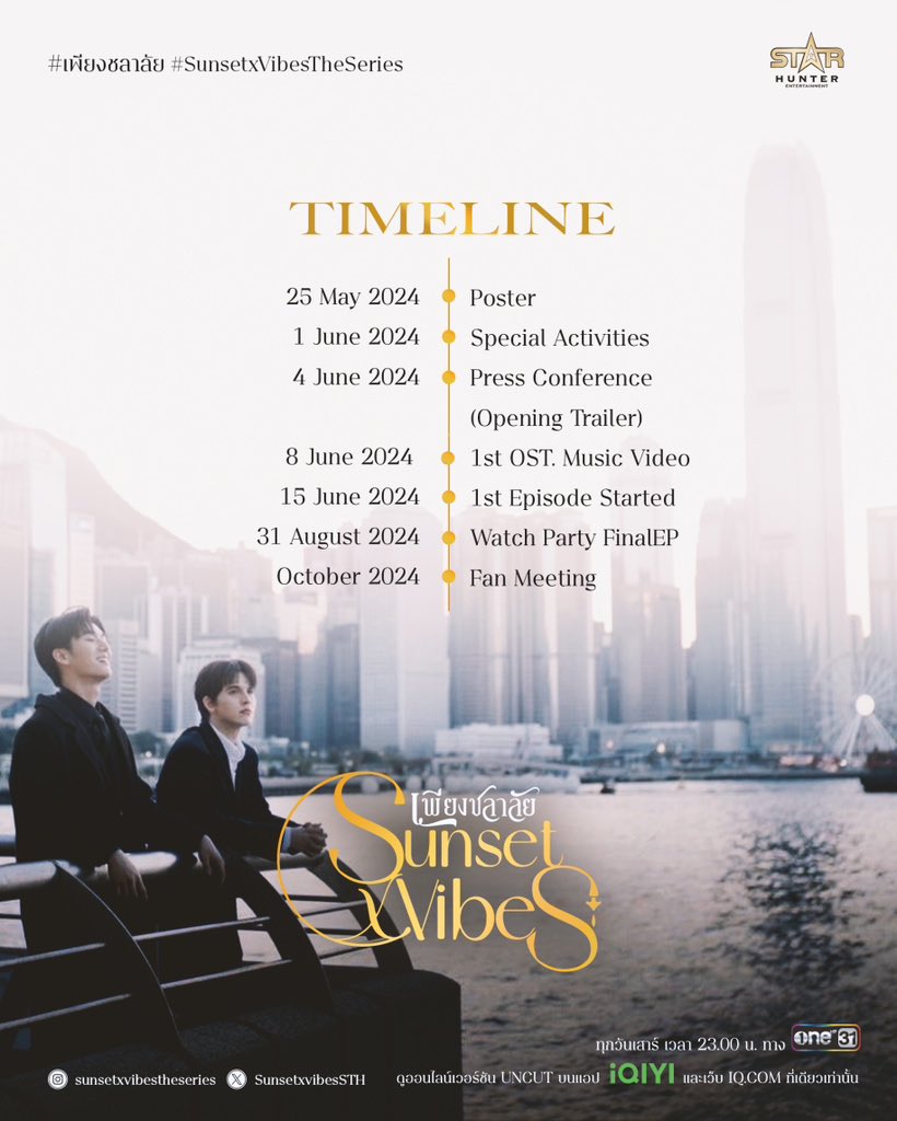 Die thailändische BL-Serie Sunset X Vibes startet am Samstag, den 15. Juni 2024. Das Finale ist am Samstag, den 31. August 2024, also soll es 12 Folgen geben. Sie wird auf iQIYI zu sehen sein.
