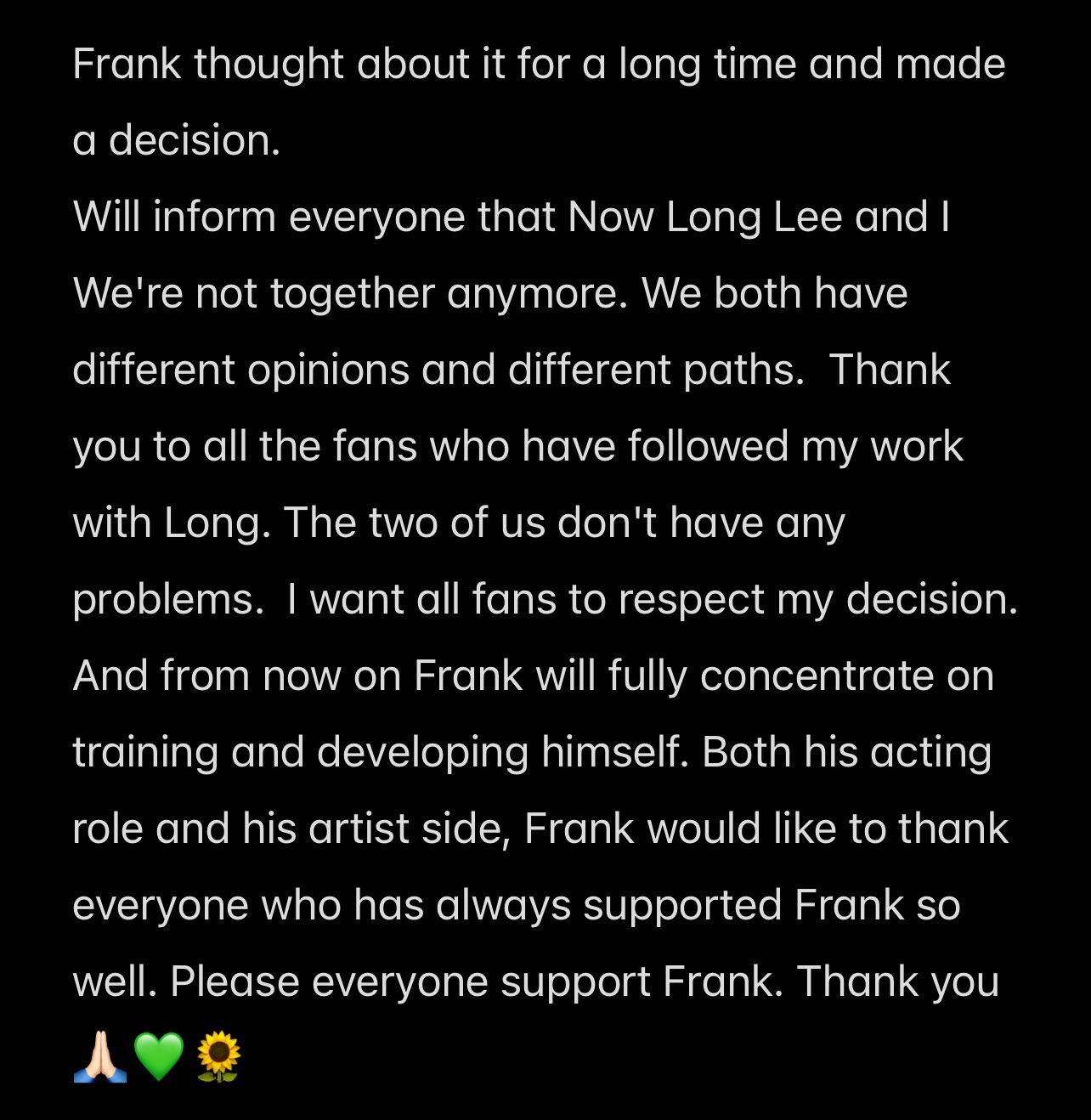 Frank Thanatsaran gab bekannt, dass er sich von seinem Filmpartner Lee Long Shi als BL Schiff trennt. Die beiden haben in „Crazy Handsome Rich“, „OMG Vampire“ und „Love Syndrome III“ zusammengearbeitet.