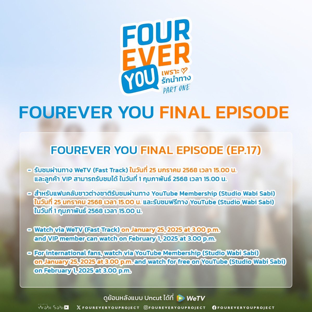 FINALE: #FourEverYouProject gibt Zeitplan für letzte Folge (EP17) bekannt. Studio Wabi Sabi hat angekündigt, dass das mit Spannung erwartete Finale von „Fourever You: Part 1“ am 25. Januar im Fast Track auf WeTV Premiere feiern wird, und am 01. Februar ist die Finale Episode für alle auch auf Youtube verfügbar.