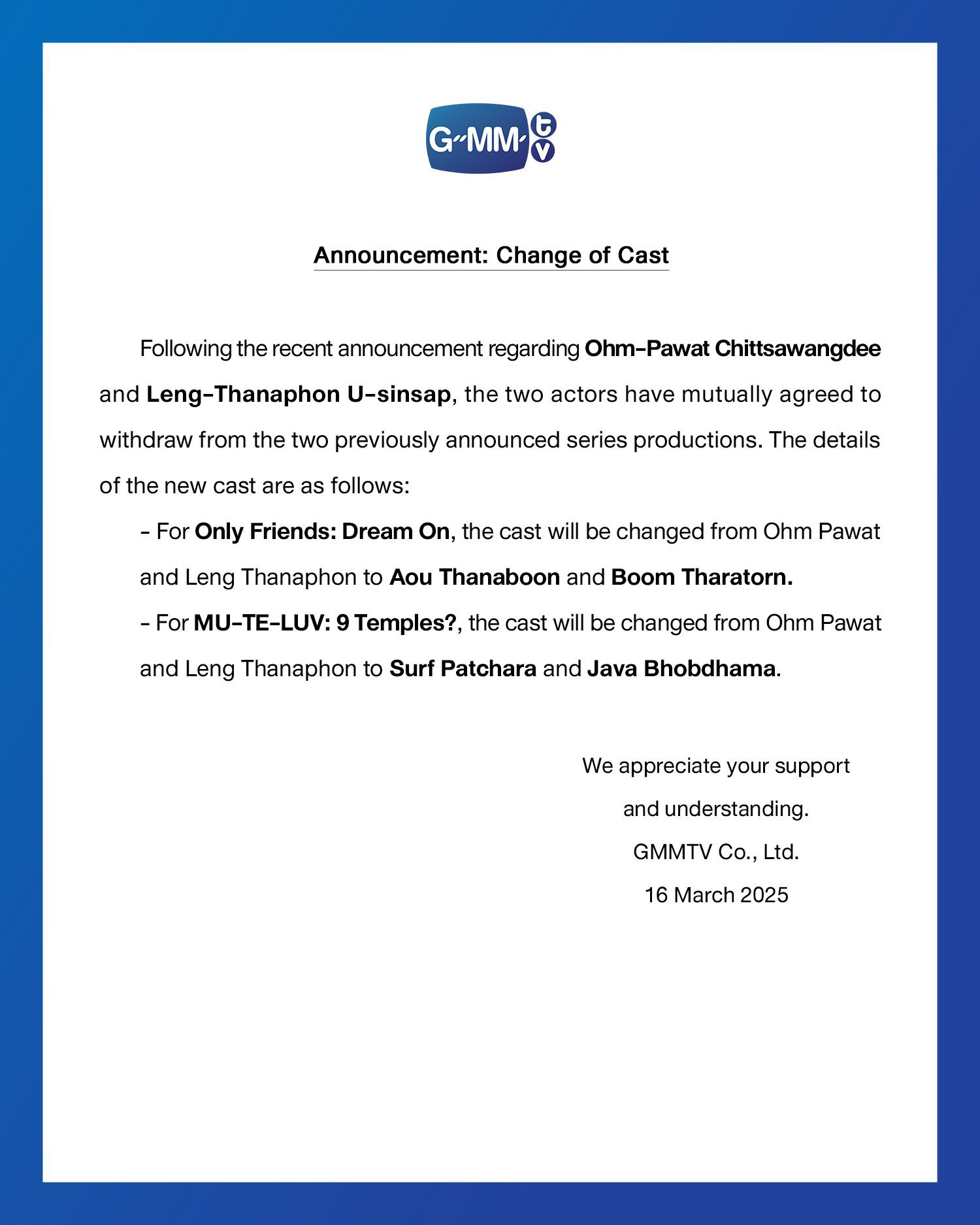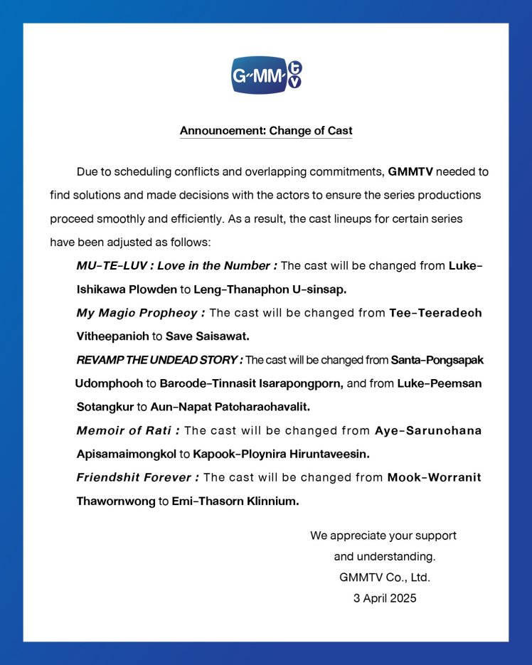 In diesem Zusammenhang gab GMMTV bekannt, dass #AouBoom von „We Are“ und „Perfect 10 Liners“ ihre Rollen in „Only Friends: Dream On“ übernehmen werden, während #SurfJava die Rolle in „MU-TE-LUV: 9 Temples?“ übernimmt.