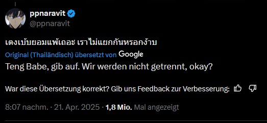 Es existiert ein Hate Account auf X (nur einer unter vielen), dessen Ziel es ist, Pond und Phuwin zu trennen. O-Ton: „Ich werde da sein bis zu dem Tag, an dem sich Pondphuwin trennt.“ In jedem Post, wird Pond markiert, immer und immer wieder. Jetzt hat Pond reagiert. Seine Antwort: „Schatz, du kannst aufgeben … Wir werden uns nicht trennen, nein!“
